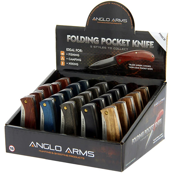 This legal carry knife from Anglo Arms is the perfect edition to your EDC, It features a non-locking blade and has a wooden handle. Various colours supplied.