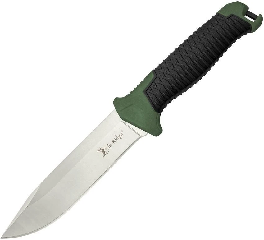 11″ (27.94cm) overall. 5.5″ (13.97cm) satin finish 8Cr13MoV stainless blade. Green nylon handle with black rubber overmold. Full tang. Lanyard hole. Sheath features a fire starter and sharpener. Black nylon belt sheath