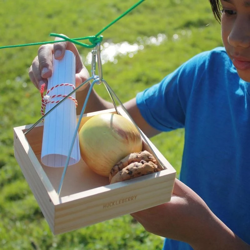 - The cables can attach to trees, tables or posts. Fill the basket with your favorite toys or objects! Friends can transport items from one side to the other.