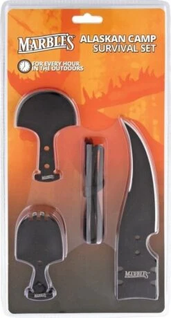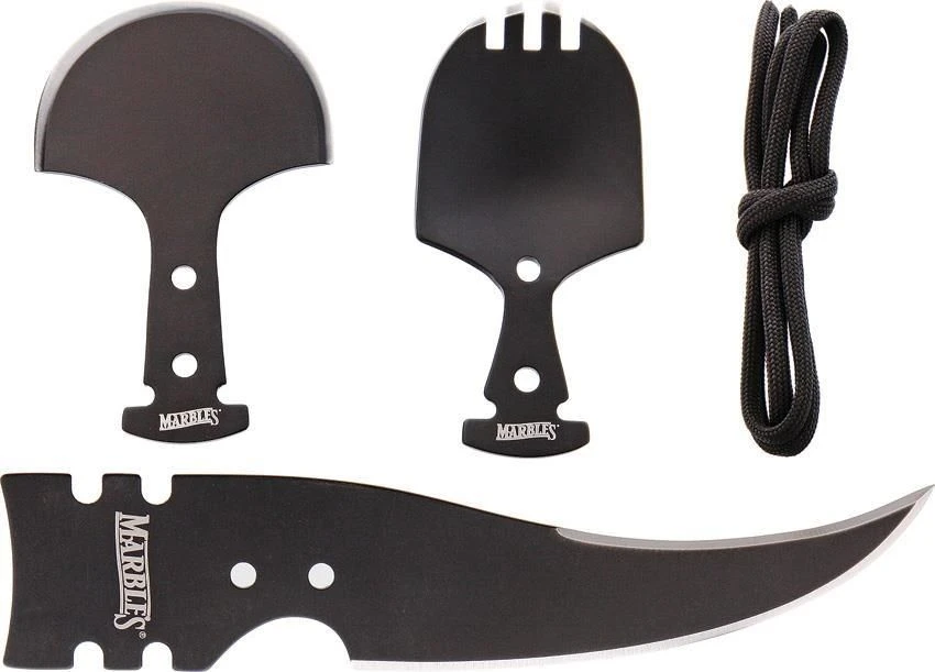 Set includes spork head, Ulu head, 6″ hunting blade, and starter length of paracord. All tools are black finish stainless construction