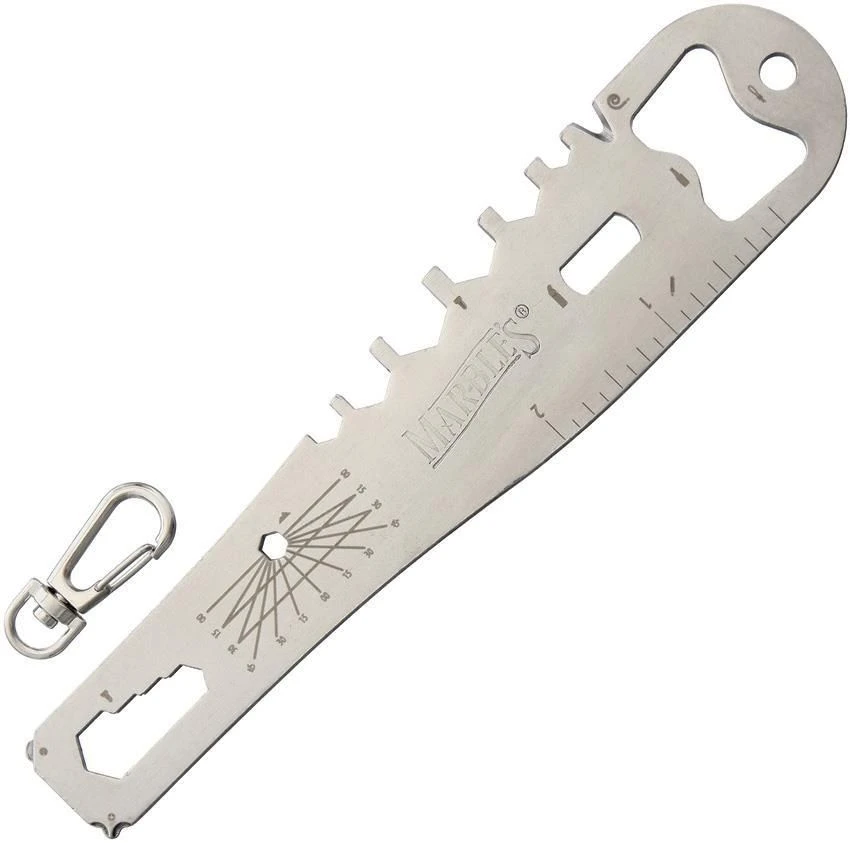Stainless; Overall: 7″; Additional Tools: Bottle Opener l Wire Stripper l Carabiner l Philips Screwdriver l Ruler l Large Screwdriver; Other Info: Oxygen wrench, common wrench slots, universal hex wrench slot, rangefinder, and lanyard hole