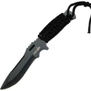 This multi-purpose knife works great for any task. It features a sharp and durable stainless steel blade with sawteeth on the back. The laced handle fits comfortably in your hand and offers an excellent grip.