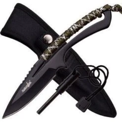 The uniquely designed Survivor Fixed Blade Outdoor Knife (model HK-767CA) features a full tang construction blade and a cord-wrapped handle, with an 8-inch overall length. Ideal for camping expeditions and outdoor survival training, this Survivor full tang knife features a 4.25-inch black stainless steel blade. The cord wrapped handle gives you superior grip in even the wettest of conditions, while also providing easily unwrapped cordage when needed in a pinch. The included magnesium alloy fire starter enables you to effortlessly start a fire in no time. This knife comes complete with a nylon sheath for easy and safe carry. Geared toward outdoor activity, Survivor offers a wide variety of classic survival knives and rugged fixed blade knives.